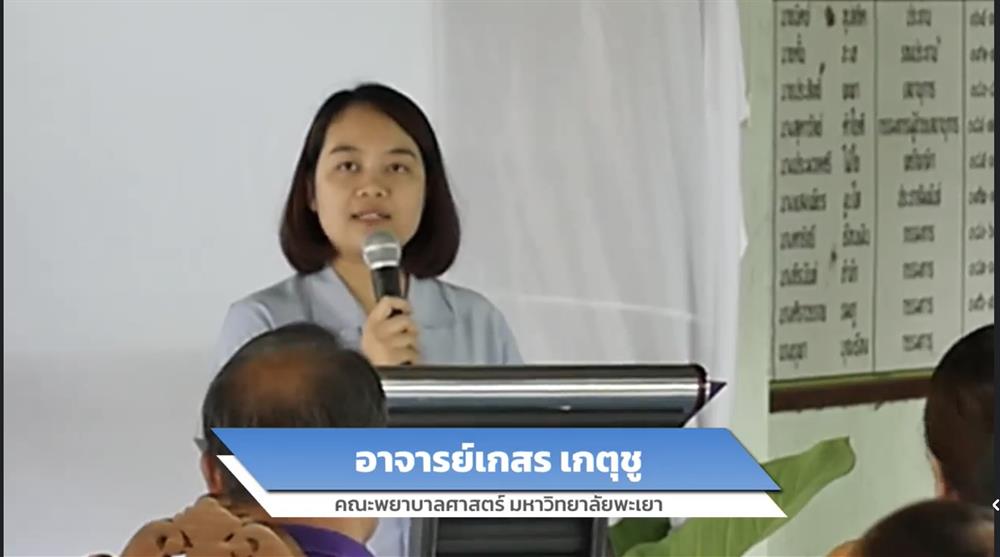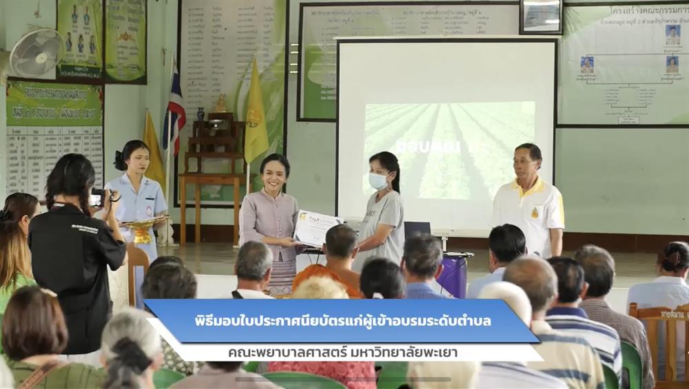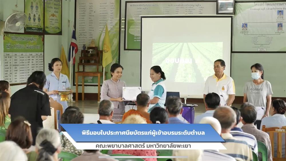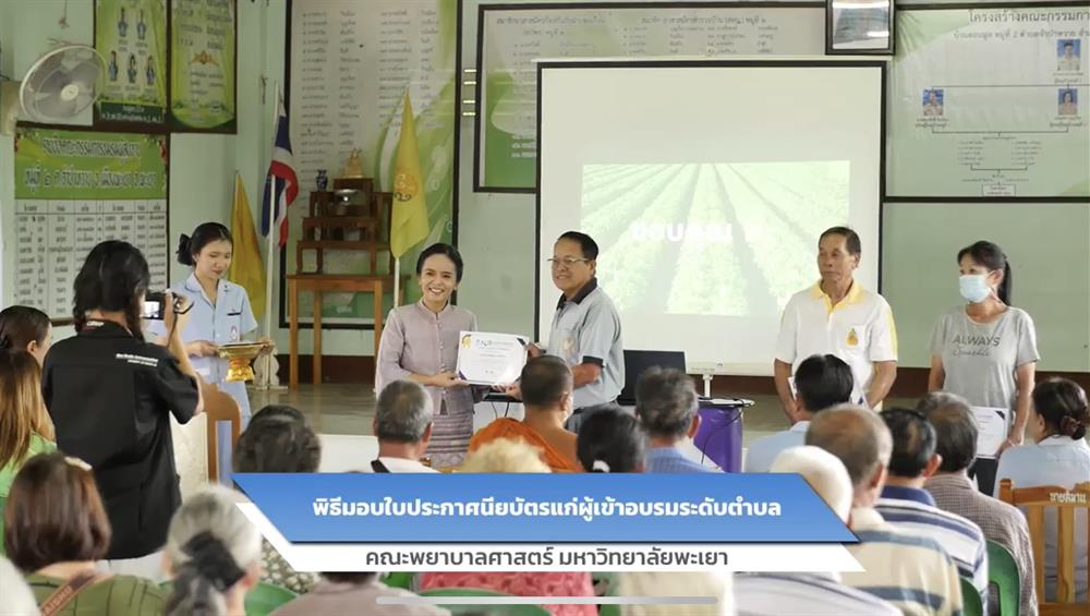 ทั้งนี้ ผู้ช่วยศาสตราจารย์ ดร.ดาว เวียงคำ คณบดีคณะพยาบาลศาสตร์ มหาวิทยาลัยพะเยา ให้เกียรติเป็นประธานในพิธีเปิด พร้อมมอบใบประกาศนียบัตรแก่ผู้ผ่านการอบรมระดับตำบล และร่วมถ่ายภาพเป็นที่ระลึก