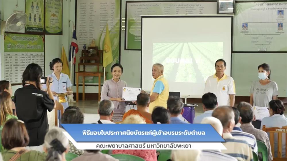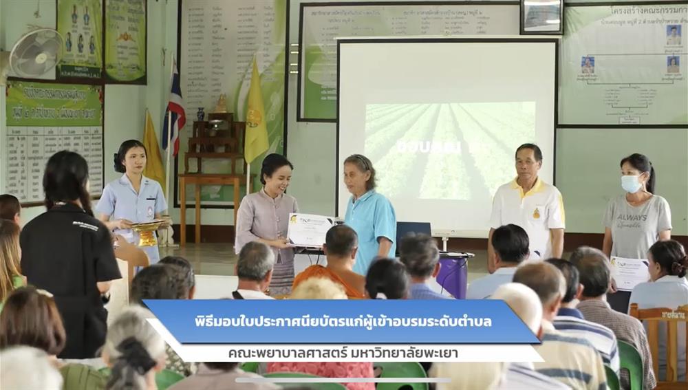 ทั้งนี้ ผู้ช่วยศาสตราจารย์ ดร.ดาว เวียงคำ คณบดีคณะพยาบาลศาสตร์ มหาวิทยาลัยพะเยา ให้เกียรติเป็นประธานในพิธีเปิด พร้อมมอบใบประกาศนียบัตรแก่ผู้ผ่านการอบรมระดับตำบล และร่วมถ่ายภาพเป็นที่ระลึก